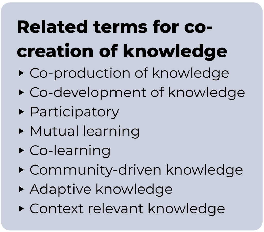 Co-creation of knowledge is the process of bringing together the knowledge systems of different groups, recognizing that each party brings distinctive perspectives and that working together can produce better results. Co-creation is a continuous process in which those participating need to have real influence. If not, the power stays with the technology developers.