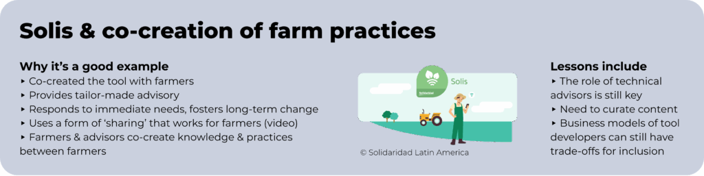 Solis, developed for technical assistance, emphasizes the human component by curating farmer-generated content through a social media-like interface. The tool combines top-down (expert-to-farmer) with bottom-up (farmer-to-expert) & peer-to-peer (farmer-to-farmer) communication channels to foster the co-creation of locally relevant agroecological practices.